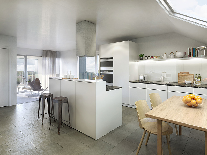 Sämtliche Küchen und Bäder sind gemäss den geltenden Normen für hindernisfreies Bauen konzipiert. Das nachträgliche Anbringen von Klappsitzen und Haltegriffen in den Bädern wird bereits beim Bau vorbereitet.